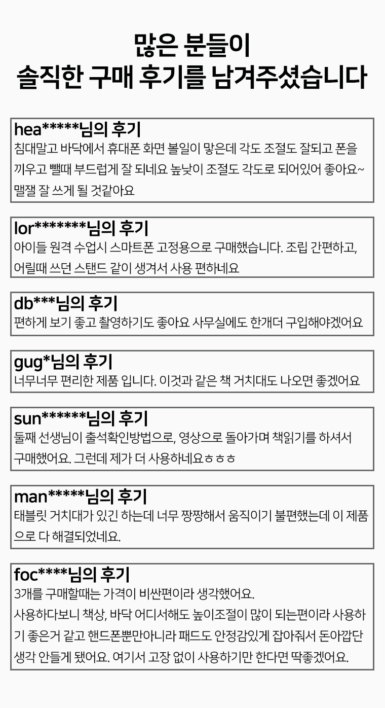 단점 : 제조사에 따라 받침대가 가벼워 넘어짐 현상이 있는 경우 발생, 침대용 장축 막대의 경우도 넘어짐 현상 발생.
